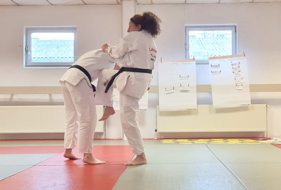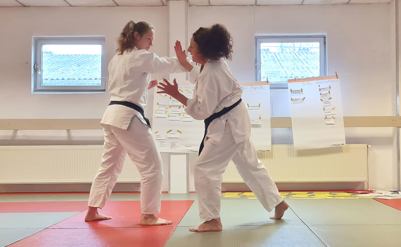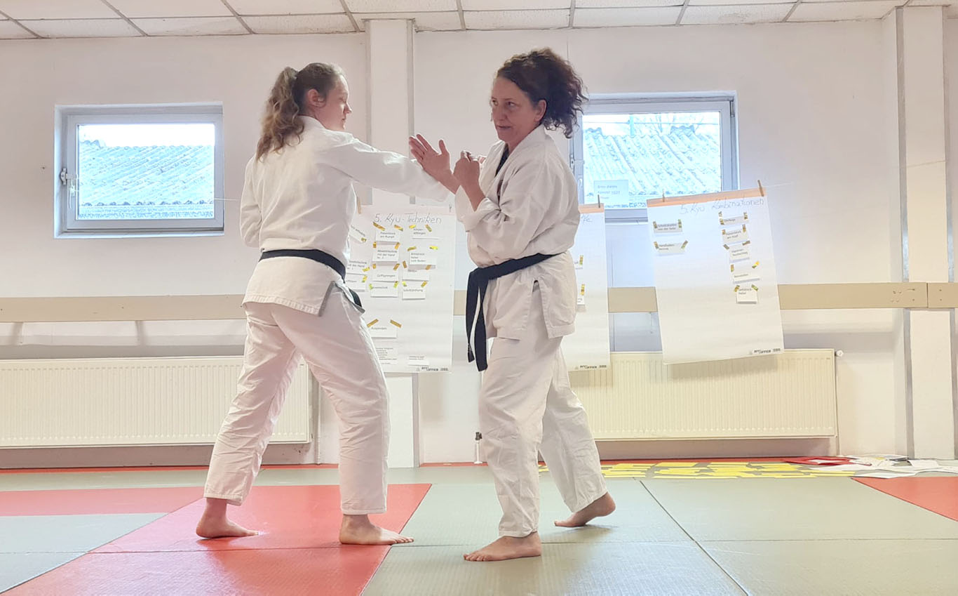 Ein Schwerpunkt des gesamten Lehrgangs lag auf Vielfalt und Kreativität bei den Angriffen. Deshalb waren die sonst häufig genutzten Angriffe Schwinger, Ohrfeige, Rückhandschlag und Griff ins Revers bewusst ausgeschlossen. So wurden alle dazu angeregt, ihr Prüfungsprogramm breiter zu denken und abwechslungsreicher zu gestalten.