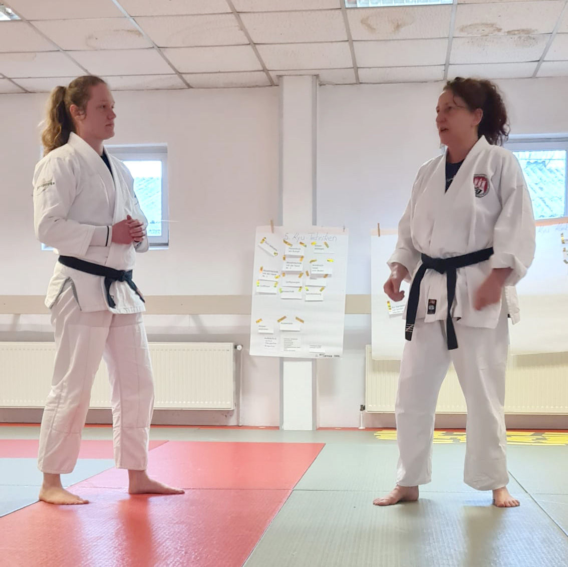 Am letzten März-Samstag fand im Anschluss an die Mitgliederversammlung des HJJV im Landesleistungszentrum ein HJJV-Techniklehrgang zum Thema „Tipps und Tricks fürs Prüfungsprogramm“ statt. Geleitet wurde der Lehrgang von Fatma Keckstein (5. Dan) und Jessica Diekmann (3. Dan). Insgesamt nahmen 18 Ju-Jutsuka mit Graduierungen vom 6. Kyu bis zum 7. Dan teil. Diese breite Mischung sorgte für einen spannenden Austausch und machte den Lehrgang für alle Beteiligten interessant.