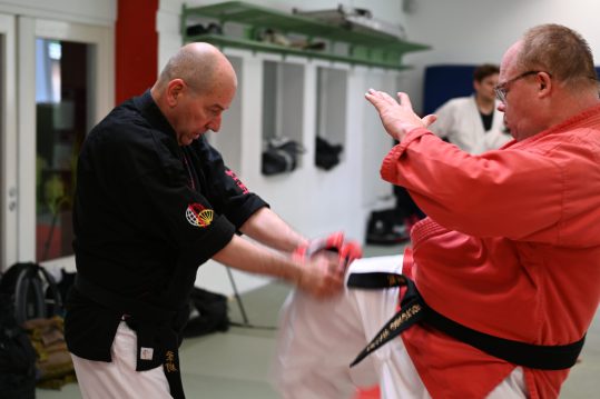 Die Lehrgangsteilnehmer übten zunächst leichte Pratzenarbeit als Einstieg, erarbeiteten dann schrittweise erste Schlag-Hebel-Kombinationen und steigerten sich nach der Pause in komplexe Abfolgen mit fließendem Übergang. Typisch für die Technikfolgen von Alain: dichte Sequenzen verschiedener Atemi-Techniken mit nahtlosem Wechsel zur Arbeit am Boden. Ein Beispiel einer Kombination zum Ausprobieren: Block gegen Schwinger kombiniert mit Handballenstoß und Ellbogenstoß zum Kopf, gefolgt von Schlag auf den Bizeps, Handkantenschlag zu den Rippen und Unterarmschlag zum Hals; anschließend Ansatz Kipphandhebel, Hebel halten, Knieschlag, dann Fußstoß in die Kniekehle und Einspringen in den Arm des Angreifers nach hinten in Richtung Boden.