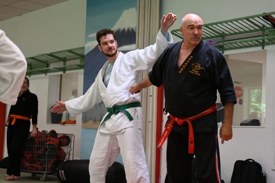 Die Lehrgangsteilnehmer übten zunächst leichte Pratzenarbeit als Einstieg, erarbeiteten dann schrittweise erste Schlag-Hebel-Kombinationen und steigerten sich nach der Pause in komplexe Abfolgen mit fließendem Übergang. Typisch für die Technikfolgen von Alain: dichte Sequenzen verschiedener Atemi-Techniken mit nahtlosem Wechsel zur Arbeit am Boden. Ein Beispiel einer Kombination zum Ausprobieren: Block gegen Schwinger kombiniert mit Handballenstoß und Ellbogenstoß zum Kopf, gefolgt von Schlag auf den Bizeps, Handkantenschlag zu den Rippen und Unterarmschlag zum Hals; anschließend Ansatz Kipphandhebel, Hebel halten, Knieschlag, dann Fußstoß in die Kniekehle und Einspringen in den Arm des Angreifers nach hinten in Richtung Boden.