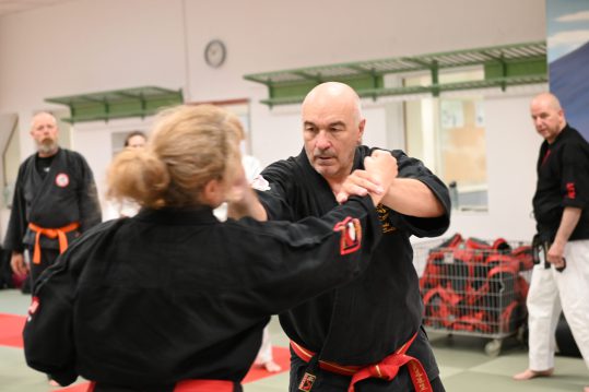 Die Lehrgangsteilnehmer übten zunächst leichte Pratzenarbeit als Einstieg, erarbeiteten dann schrittweise erste Schlag-Hebel-Kombinationen und steigerten sich nach der Pause in komplexe Abfolgen mit fließendem Übergang. Typisch für die Technikfolgen von Alain: dichte Sequenzen verschiedener Atemi-Techniken mit nahtlosem Wechsel zur Arbeit am Boden. Ein Beispiel einer Kombination zum Ausprobieren: Block gegen Schwinger kombiniert mit Handballenstoß und Ellbogenstoß zum Kopf, gefolgt von Schlag auf den Bizeps, Handkantenschlag zu den Rippen und Unterarmschlag zum Hals; anschließend Ansatz Kipphandhebel, Hebel halten, Knieschlag, dann Fußstoß in die Kniekehle und Einspringen in den Arm des Angreifers nach hinten in Richtung Boden.