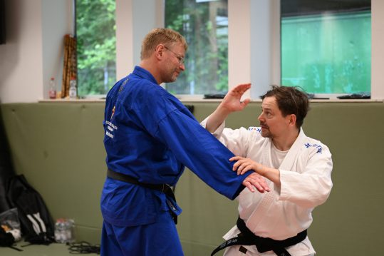 Zum „Budo-Silberjubiläum“ begrüßte Jens Keckstein (7. Dan Ju-Jutsu und Präsident des HJJV) Alain mit einer kleinen Aufmerksamkeit, dann ging es bei herausfordernden Temperaturen auch gleich zur Sache: Im Mittelpunkt des Lehrgangs stand ein abwechslungsreiches, forderndes Programm, das Saillys internationale Goshindo-Techniken demonstrierte: Von klassischen Hebel- und Atemi-Techniken über moderne Konzepte bis hin zu dynamischen Kombinationen aus Ju-Jutsu und Sambo bot der Großmeister ein wahres Feuerwerk an Bewegungsabläufen.