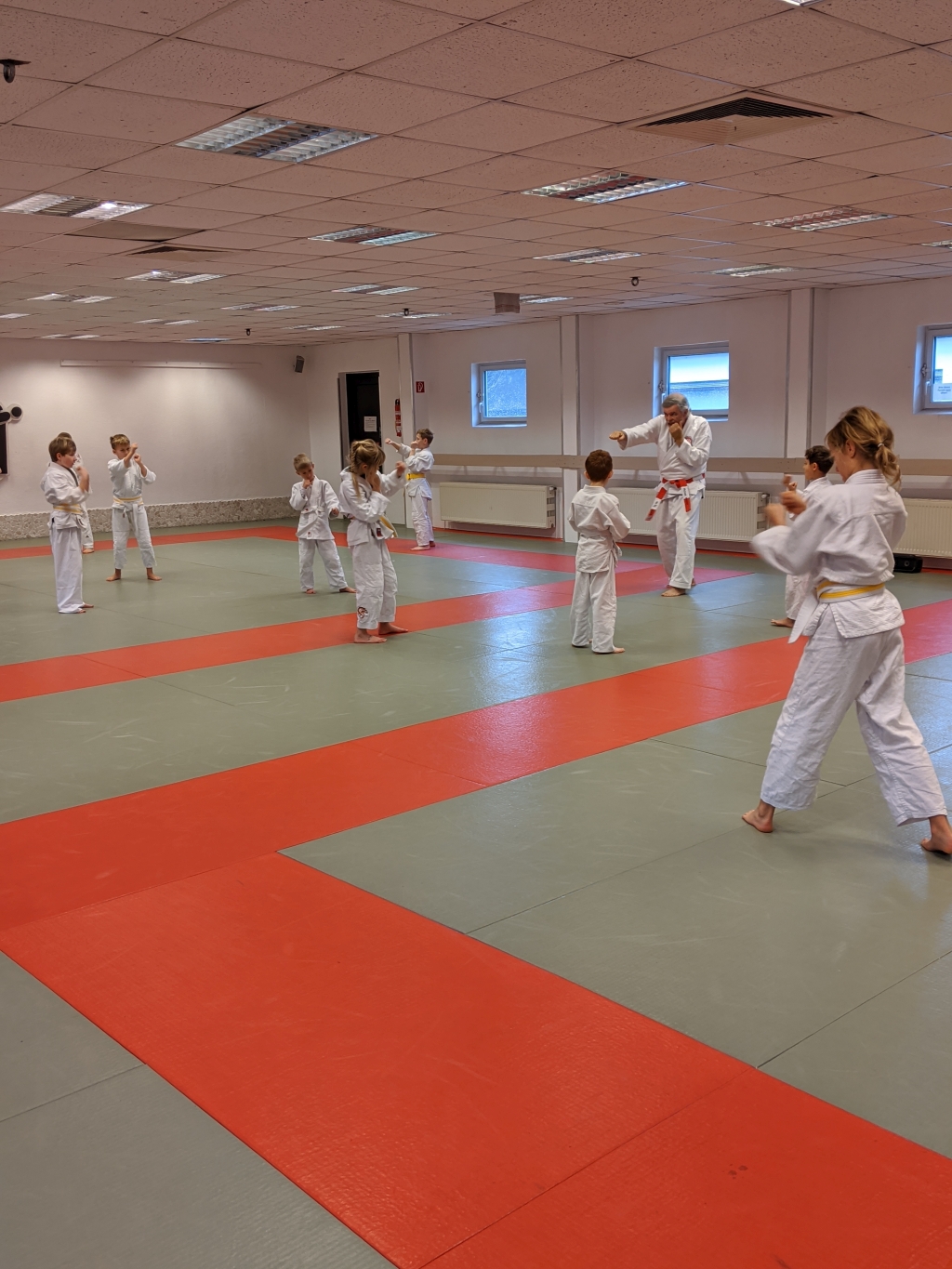 In zwei Altersgruppen gab Michael Richter als Referent von seiner langjährigen Erfahrung als Polizist und Ju-Jutsuka den Kindern praktische Tipps mit: Was mache ich draußen, was klappt überhaupt? Diese Fragen ging Michael mit den Kindern an. Das wichtigste Verteidigungsmittel, was wir haben, wurde gleich beim Aufwärmen eingebaut: unsere Stimme. Entsprechend laut wurde es im Dojo.