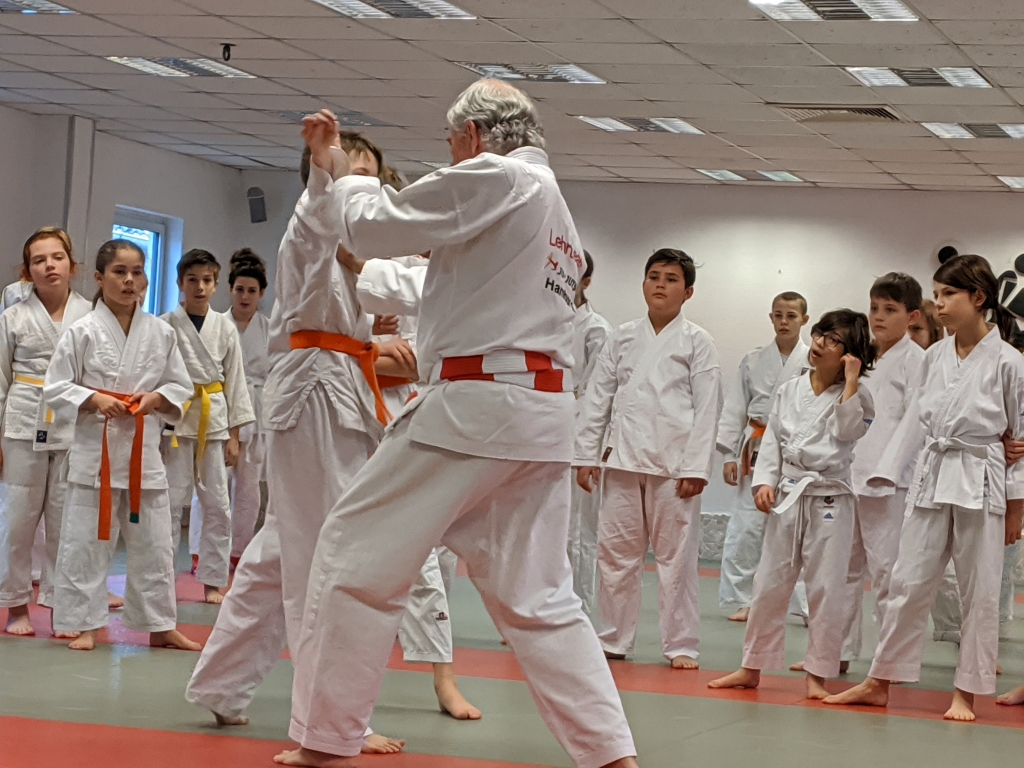 In zwei Altersgruppen gab Michael Richter als Referent von seiner langjährigen Erfahrung als Polizist und Ju-Jutsuka den Kindern praktische Tipps mit: Was mache ich draußen, was klappt überhaupt? Diese Fragen ging Michael mit den Kindern an. Das wichtigste Verteidigungsmittel, was wir haben, wurde gleich beim Aufwärmen eingebaut: unsere Stimme. Entsprechend laut wurde es im Dojo.